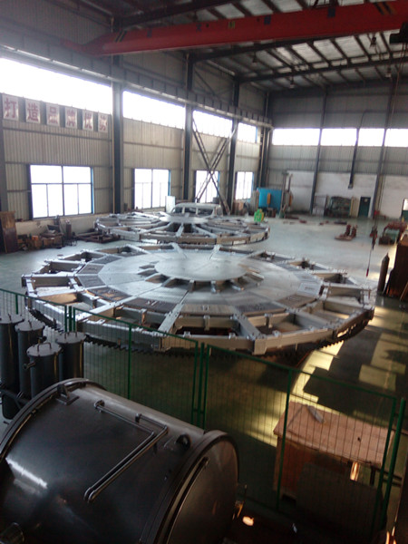 近期,我公司與與遼寧營口盛?;び邢薰竞炗喴惶兹詣佣渴綀A盤澆鑄機制作安裝合同。該圓盤澆鑄機為16模雙圓盤結(jié)構(gòu),采用鉤取方式取板。目前,該設(shè)備已經(jīng)在公司內(nèi)部完成加工和組裝工作。